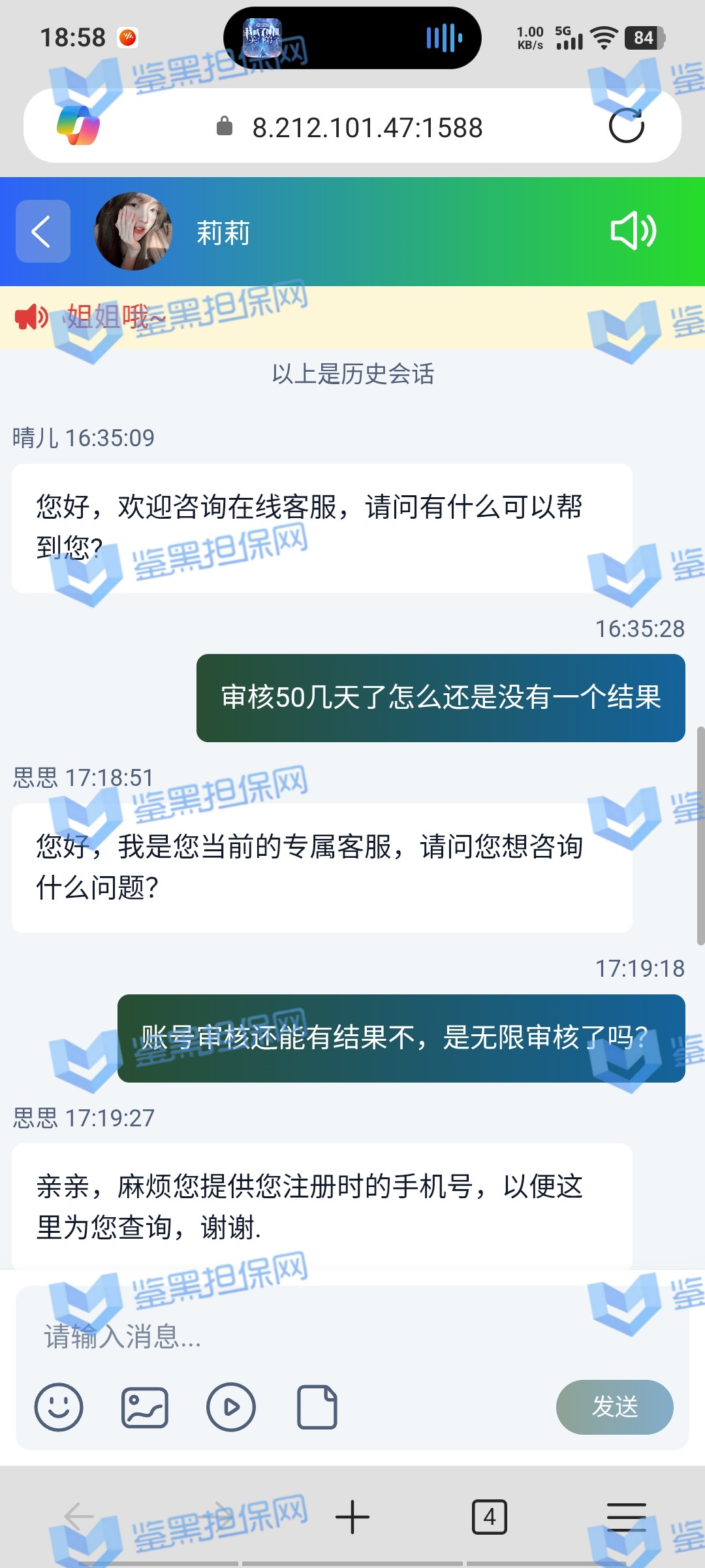 4、鉴黑担保网维权专员多次联系该平台相关负责人,一直收到的回复是此玩家账号注单存在异常,目前还在审核当中,鉴黑担保网维权专员咨询平台需要审核多久,具体什么时候可以审核完毕,无法提供审核结束时间,拒绝更多沟通,随后封闭对话沟通渠道。