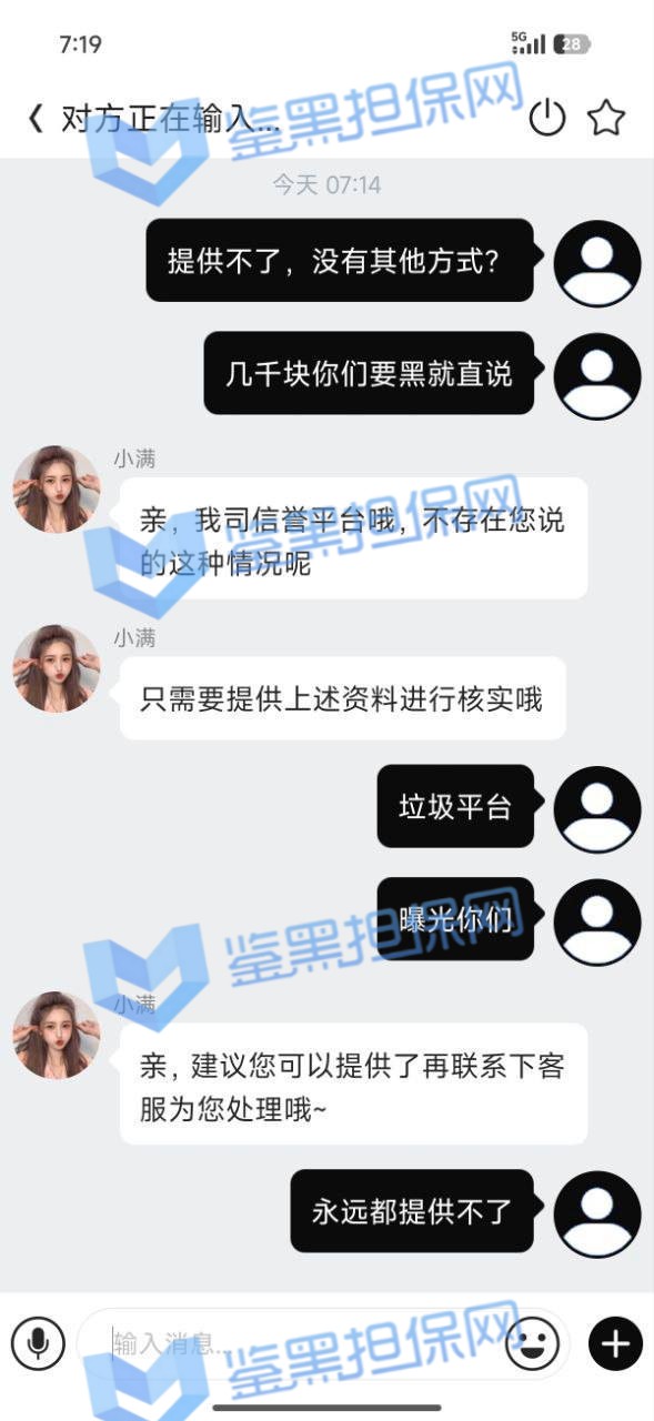 2、鉴黑担保网维权专员联系该平台相关负责人核实情况,对方无法说明让其提供这些资料的原因,也无法说清楚对方是否存在异常投注行为等原因,只是一味要求必须提供这些相关信息进行审核,存在刁难用户的恶劣行为,且该会员提款金额较大,故盈利金额也较大,这是平台不愿出款的借口,且沟通过程中态度恶劣,可判定为黑平台!!