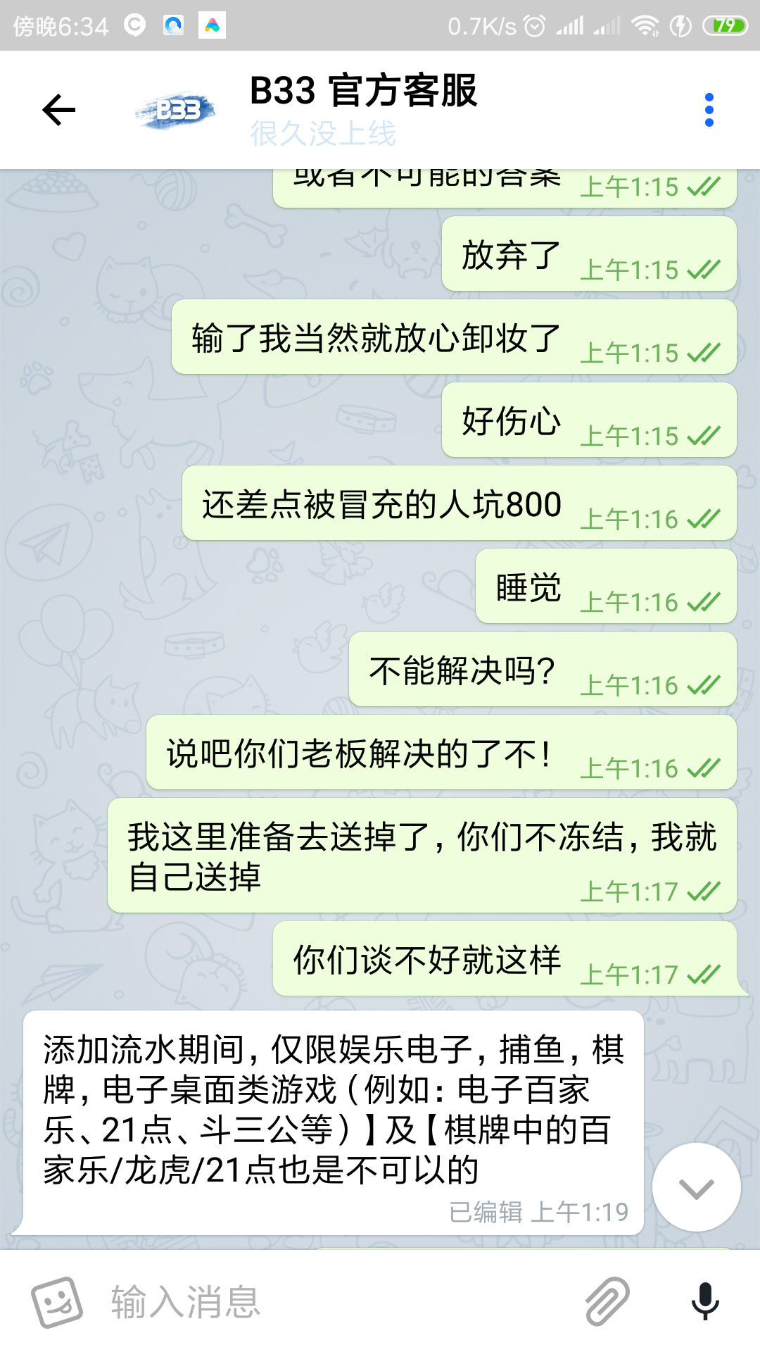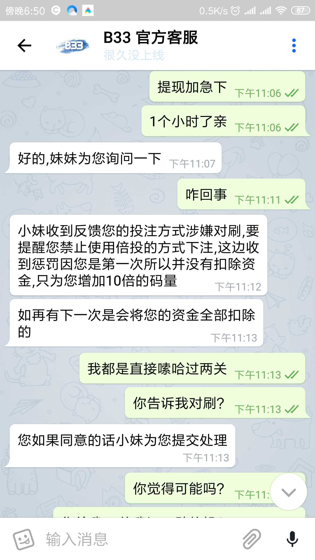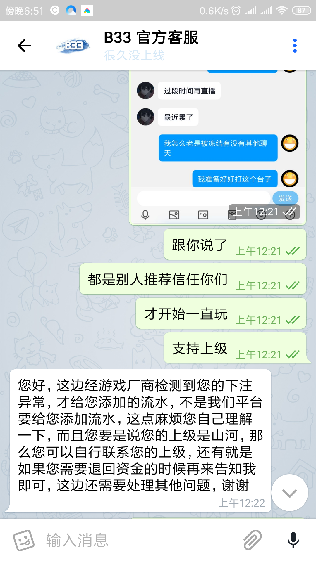 注册没几天!看一个山河直播,他推广b33很长时间,经常直播,QQ群最近没了也没有直播了,联系方式都被腾讯打没了可能!他作担保的平台,不少人也说这台子不黑的,我才开始准备好好打!我玩了首存100+38!出款了,后面500玩电子剩下80一炮出6400!这台子确实能爆!就去充值2000嗦哈真人过两关!提现8000说我倍投下注,涉嫌对打!我就很纳闷了!我在自己玩的老台子百多万啊怎么没出现过!给我10倍打码电子棋牌捕鱼,我还专门直播给玩家们,确实很爆,还打出2.4个出来!提现就出款通道维护,你这层级维护,系统维护完成就可以出款!客服无法告知你出款具体时间!我都说了我是找别人担保我想好好找个台子,跳槽过来娱乐的,我这又去自己老台子充值5000嗦哈输了又去1000输了,这都没啥,你不黑,凌晨提现到现在到账了我早都5000在平台电子了!你黑我比我输钱还要难受知道吗?审核完成都是假的,老玩家,大家都懂!希望大家自己注意,我玩了很多年了,朋友叫我来这个鉴黑网曝光,还会帮你处理!以后还是玩大台子能担保的!看上面,只要能解决这个事,搞臭他都行!