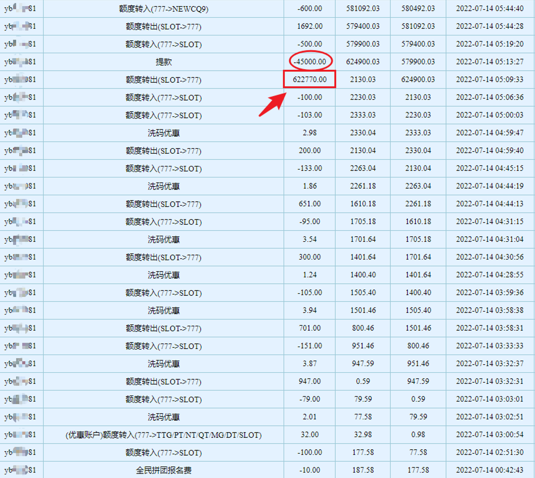 从上图可以一目了然的看到,幸运儿在凌晨0点42分仅仅存款200元转账至老虎机钱包,用了近5小时就爆了奖池转出了622770。(截稿玩家还在陆续提款)
